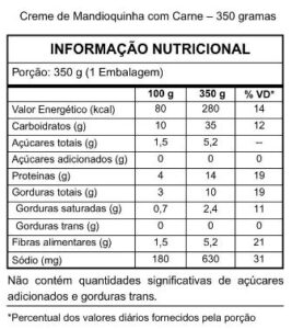 Água, mandioquinha, carne bovina sem gordura, cebola, azeite de oliva, alho, sal, pimenta-do-reino e salsa.
